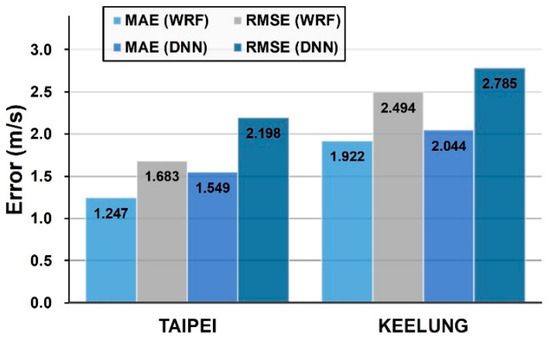Figure 11 presents the MAE and RMSE evaluation indicator results for the WRF and DNN models of Typhoon Megi and demonstrates that the WRF model MAE and RMSE simulation-error indicator results were superior to those of the DNN model. A comparison of the two stations again revealed that Keelung station exhibited greater absolute error compared with Taipei station.