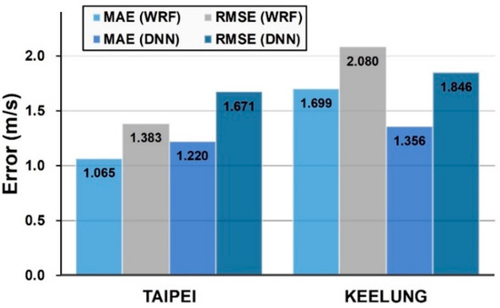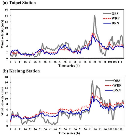 - In terms of DNN model performance, both Keelung and Taipei stations underestimated the wind speed in comparison with the actual wind speed observations. Additionally, a comparison of the results of the two stations indicated that Keelung station exhibited a larger error and was more likely to underestimate the wind speed compared with Taipei station. This result is because the DNN model learns from the wind-speed simulation values of the WRF model. Therefore, when the simulation results of the WRF model underestimate the wind speed, the DNN model simulation results exhibit similar results (underestimation).