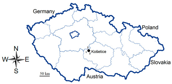 Location of the sampling site National Atmospheric Observatory Košetice (NAOK) within the Czech Republic. The location of potential polycyclic aromatic hydrocarbon (PAH) sources cities 1 (Lukavec), 2 (Košetice), and 3 (Čechtice) are indicated in the map [20].