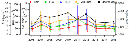 The degree-days and medians (± standard deviation) of BaP, TEQ, FLA, and PAH SUM concentrations in the cold half-year (October–March). The year 2006 stands for winter season 2006–2007, etc. The markers are shifted for better readability. FLA—representatives of “light PAHs” and indicators of local combustion effects, BaP—representative of “heavy PAHs” and a substance with threshold limit value (TLV), sum of all PAHs (PAH SUM)—indicators of total PAH pollution, and the toxic equivalency factor (TEQ)—a marker of toxic action, calculated according to [24].