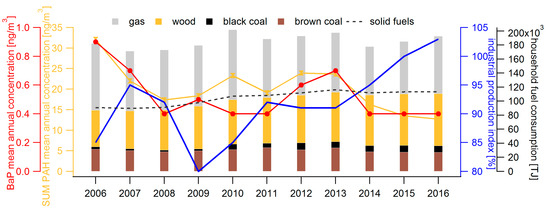 Industrial production index, household fuel consumption, and concentration of BaP and SUM PAH/10 in the Czech Republic between 2006 and 2016 (taken from: [61,64]).