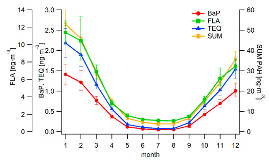 Average monthly concentrations (in ng·m−3) of 4 selected PAH representatives—BaP, TEQ, FLA, and PAH SUM (curve values) together with 95% confidence intervals for the mean (whiskers).