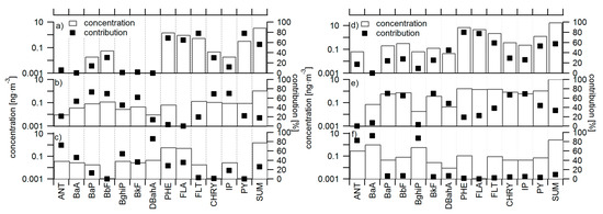 Factor 3 was characterized particularly by ANT, BaA, DBahA, and BghiP. This factor represents natural gas and/or light heating oil combustion, either at industrial sources and/or in local heating [77], or alternatively, PAHs volatilizing from the soil [78] or combustion of waste biomass in forests [79]. This is important especially in the warm period of the year when the contribution of this factor to the PAH SUM was 26% (Figure 5c) while reaching only 9% in the cold part of the year (Figure 5f).