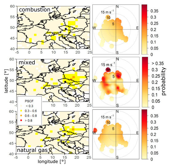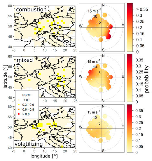 During the warm parts of the year, potential sources for the combustion factor were situated east and southeast from the study locality. The highest concentrations of this factor were identified for wind speeds over 8 m·s−1. Sources located northwest of the study locality were another possible source region for this factor (again with wind speeds over 5 m·s−1). The PSCF, however, did not show any probable sources. Potential source areas of the mixed emission factor were similar to the combustion factor. For the volatilizing factor, no specific origin area was found. Thus, in the warm period of the year, the locality was influenced predominantly by distant PAH transport from the east, southeast, and also from the west (also identified, e.g., in [73]). However, no strong potential source areas of individual PMF factors could be identified using the PSCF and CBPF in the warm part of the year (Figure 6).
