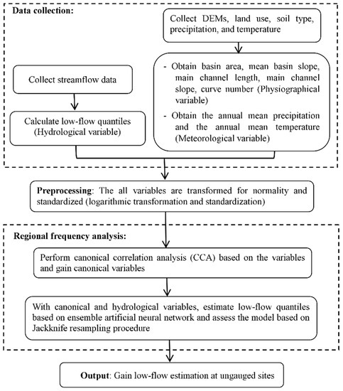 Section 3.1. In RFA, the appropriate data preprocessing steps are required before performing the analysis. In the preprocessing stage, the physiographical, meteorological, and hydrological variables were standardized. Then, we obtained the standardized database that has a mean of zero and standard deviation of one, and asymmetry in the variables could then be assessed. With the database, RFA using CCA and ANNs were performed to estimate the low-flow quantiles in ungauged basins. We specifically describe the RFA application process and provide a diagram of the procedures that were used to obtain the low-flow estimates in