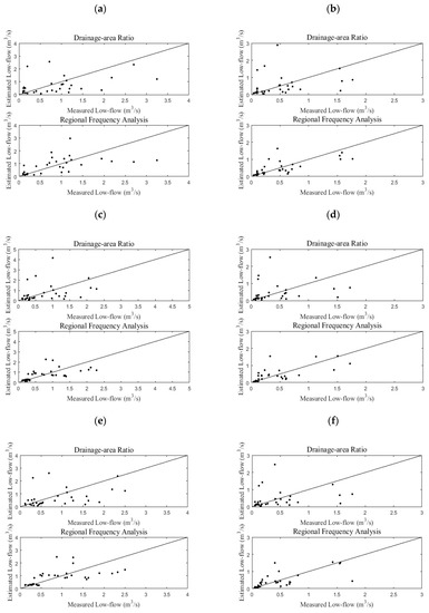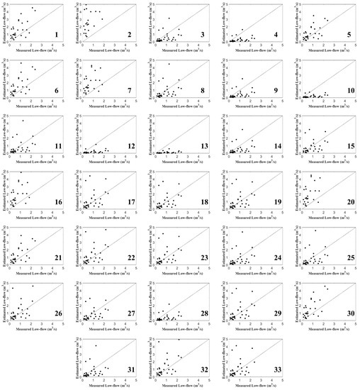 In the evaluation procedure, we use the jackknife resampling technique to compare the relative performance of each model that was used to estimate the low-flow quantiles at ungauged locations. In this procedure, the low-flow records in each drainage basin were temporarily removed from the database to assume that the site represented an ungauged location. Each model was calibrated using the data from the remaining sites. Then, regional estimates could be obtained for the ungauged river basins based on the calibrated models that were proposed in the study, and these estimates were compared to the at-site estimates, which were also called local estimates.
