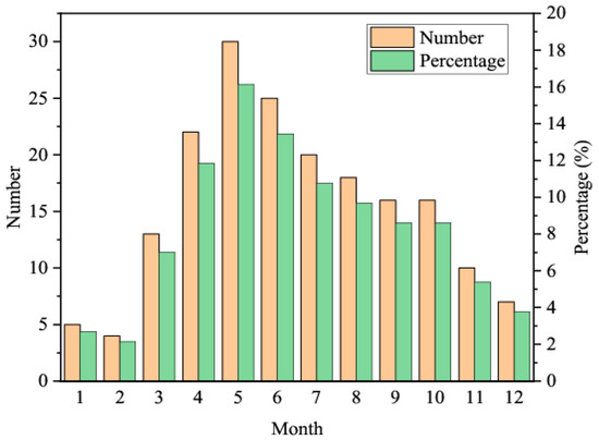 Using the 2.5° × 2.5° horizontal resolution data described in Section 2.1 and the method described in Section 2.2, a total of 186 COL events were identified in Northeast Asia in the 11-year period. Figure 1 shows the monthly distribution of COLs during this period, which clearly shows strong seasonal variations. The COLs mainly occurred in the late spring (May), with 16.13% of all cases, followed by early summer (June), with 13.44% of all cases. Spring and summer (from March to August) accounted for 68.82% of all cases during the 11 years. This seasonal pattern was consistent with observations made previously [18].