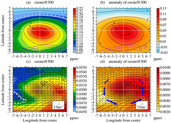 Figure 6 is the same as in Figure 5, but for 500 hPa. Figure 6 also indicates the relationship between variation in the ozone concentration and the evolution of COLs. The ozone anomaly gradually increased from the pre-formation stage to the formation stage (Figure 6a,b), and then gradually decreased until its decay (Figure 6c,d). Another important feature of Figure 6 is the anticlockwise rotation of the high ozone concentration region during the evolution of COLs. The ozone rotated from the south part of the COLs in the pre-formation stage (Figure 6a) to the southeast in the formation stage (Figure 6b) and then to the east in the mature stage (Figure 6c). This ‘rotating’ feature of the ozone during COLs evolution further demonstrates that the horizontal distribution of ozone at 500 hPa is related to the surrounding strong anticlockwise circulation of COLs. This is consistent with the ozone distribution patterns shown in Figure 3c,d which were caused by the ‘rotary’ invasion discussed in Section 3.1.