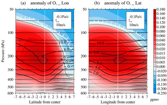 The meridional and zonal cross sections of the ozone anomalies along the center of COLs shown in Figure 4 further illustrate that stratospheric ozone was transported downward as the tropopause descended, which resulted in an increased ozone concentration in the UTLS region. The superimposed PV and wind vector fields show that the PV isolines in the UTLS region formed a funnel shape and the 2 PVU isolines dipped as low as the surface of 450 hPa. Furthermore, the area with a large ozone positive anomaly corresponds to the funnel shape of the PV.