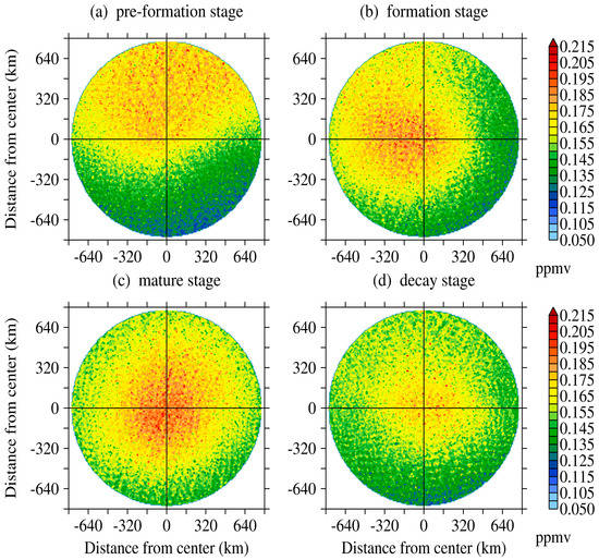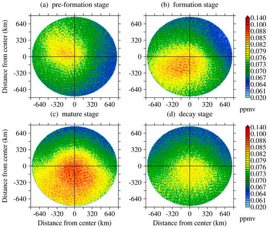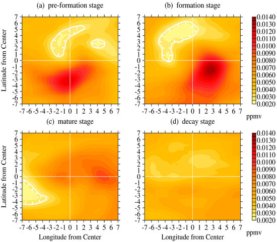 In the middle troposphere (Figure 8), the range and variation of the ozone concentration were also found to be linked to the life cycle of COLs. From the pre-formation to the mature stage, the enhanced ozone region gradually extended, and the concentration gradually increased, with a maximum value of about 0.13 ppmv. The climatic annual average concentration of ozone at this latitude and altitude is reportedly 0.0636 ppmv [48]. In the decay phase, the range and value of the ozone concentration were significantly reduced. Another prominent feature of the pattern of ozone distribution was the high ozone concentration region, which varied in the different stages of COLs evolution. The high ozone concentration region rotated anticlockwise around the center of COLs. As the COLs developed from the pre-formation to the decay stage, the enhanced ozone region was mainly concentrated in the northwest (second quadrant, Figure 8a), and then moved to the southwest (third quadrant, Figure 8b), to the south (third-fourth quadrant, Figure 8c), and, lastly, moved to the southeast (fourth quadrant, Figure 8d). This indicates that, during the development of COLs, according to the AIRS satellite data, the distribution of the ozone in the middle troposphere was affected by the surrounding strong anticlockwise circulation of COLs, which is consistent with the results revealed in the previous section using ERA-Interim data.