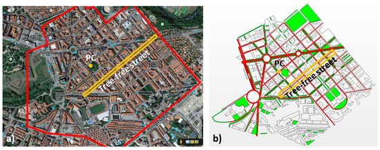 (a) Modeled area of the Pamplona neighborhood, with indication of the traffic air quality monitoring station called Plaza de la Cruz (PC) and the study tree-free street (Tafalla Street) where the ventilation is evaluated. (b) A sketch of the area of interest including emissions (red) and trees (green).