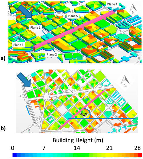 (a) Planes used for street ventilation assessment of the study street. (b) Indication of the study street orientation (right), where the blue arrow indicates the prevailing wind direction.