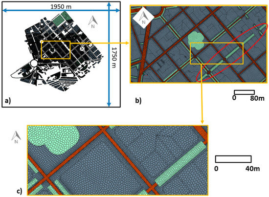 The computational domain was built following the COST (European Cooperation in Science & Technology) Action 732 best practice guidelines [25,26]. The distance between buildings and outlet and inlet boundaries was larger than 8 times the building heights and the top of domain was located 7 times the height of the tallest building (50 m). Based on grid sensitivity tests, the domain was discretized using 7.4 × 106 cells. In the study area, the grid resolution was 2.7 m approximately, with ad hoc refinements in the narrowest streets and close to the walls (cell sizes of about 1 m). A sketch of numerical domain and mesh is shown in Figure 3. Buildings and ground were modeled as walls and symmetry conditions (zero normal velocity and zero normal gradients of all variables) were imposed at the top of domain. Neutral inlet profiles of velocity, turbulent kinetic energy and its dissipation were used: