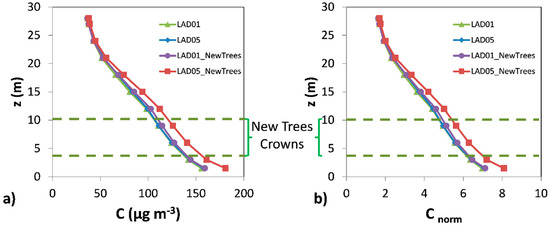 In order to extend this analysis to the whole vegetation canopy depth, the street morphology (Figure 4) and the vertical profiles of spatially-averaged concentration over this street (Figure 5) were investigated. Regarding the street morphology, the width of the street was 16 m and most of buildings were 18 m height approximately. However, the street height (Figure 2a) was considered up to the tallest building height (27 m). In addition, Figure 5b shows the vertical profiles of normalized concentration. Normalized concentration was computed as , where C is the concentration, is the reference wind speed, taken as inlet wind speed at 10 m height (Equation (12)), is the area of emissions and Q is the constant emission rate. From 1.5 m height up to about 18 m, notably higher concentration was found for LAD05_NewTrees scenario. Then, the concentration vertical profiles were divided into three zones: (a) bottom part (up to 12 m approximately) located below trees (vegetation canopy); (b) from 12 m up to mean building height (18 m approximately), where pollutant dispersion is notably affected by buildings (building canopy); and (c) from mean building height up to the maximum building height (27 m), where the influence of buildings on pollutant dispersion was smaller and it was considered to be almost outside of the urban canopy. Comparing the LAD05 and LAD05_NewTrees scenarios, the differences of spatially-averaged concentration at each height decreased as height increases. Below the vegetation canopy (below 10 m), these differences in average concentration were almost vertically constant, between 17.3 and 14.9 µg m−3 (between 12–13.4%). Above the top of the trees up to the mean building height, these differences decreased and ranged from 12.7 µg m−3 at 12 m to 6.3 µg m−3 at 18 m (from 12.7% to 9.2%). However, the zone where these differences decreased sharply was above the mean building height. Above 24 m, the spatially-averaged concentration profiles were similar (concentration differences below 1µg m−3). Therefore, the decrease of pollutant dispersion induced by the new trees with LAD = 0.5 m2 m−3 was mainly located below the tree top. It is noteworthy to remember, that in these cases, pollutant deposition was neglected.