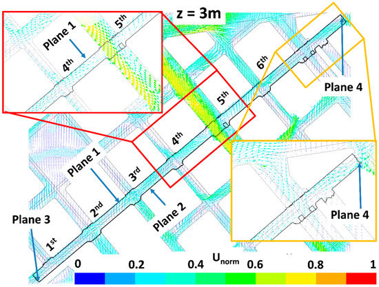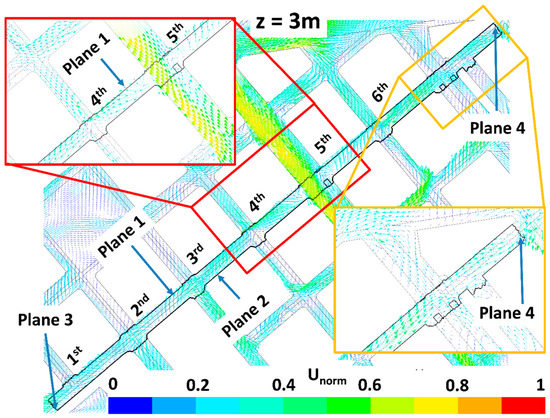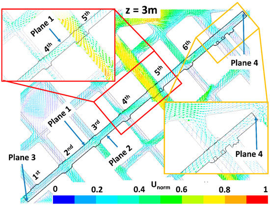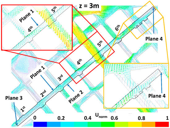 The impact of trees on pollutant dispersion and final concentration in the study street (Tafalla Street) is here explained by analyzing the wind flow patterns and the ventilation. Figure 6, Figure 7, Figure 8, Figure 9, Figure 10, Figure 11, Figure 12 and Figure 13 show the wind flow for the four scenarios at 3 m and 9 m height, respectively. In these figures, the vector color indicates the normalized wind speed (), which is computed as , where is the wind speed and is the inlet wind speed at 10 m height. Wind flow patterns were similar for all cases, however for LAD = 0.5 m2 m−3 wind speed of the fifth street perpendicular to the study street slightly decreased at both heights (Figure 6, Figure 7, Figure 8, Figure 9, Figure 10, Figure 11, Figure 12 and Figure 13). The channeling throughout this street was higher than that through the other perpendicular streets, then for LAD05 and LAD05_NewTrees the flow rate through Plane 1 (Figure 6, Figure 7, Figure 8, Figure 9, Figure 10, Figure 11, Figure 12 and Figure 13) tended to decrease. Additionally, in these cases, the part of the flow which entered the street through Plane 4 (Figure 6, Figure 7, Figure 8, Figure 9, Figure 10, Figure 11, Figure 12 and Figure 13) increased. The main wind flow changed due to the new trees found in the fourth street perpendicular to the study street. In all cases, flow departed the street through Plane 1 (Figure 6 and Figure 7), however wind speed decreased within this street in the new-trees scenarios, in particular when LAD = 0.5 m2 m−3. In addition, for this scenario (LAD05_NewTrees), it was also observed that the wind speed along the study street was slightly lower in comparison with other scenarios.