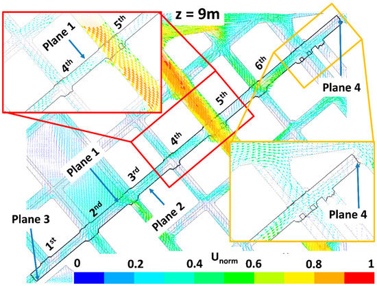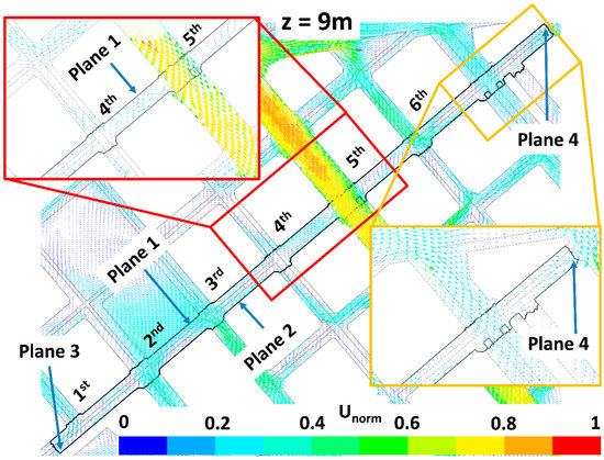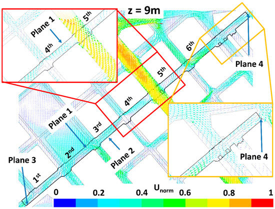 Wind flow at 9 m height for LAD01 scenario. Zooms focused on the fourth and fifth streets perpendicular to the study street and on the Plane 4 are done.