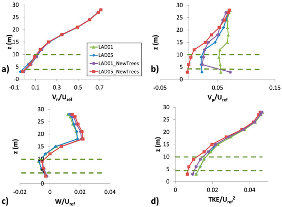 Vertical profiles of spatially-averaged flow properties within the study street. (a) Normalized wind speed normal to the street (Vn/); (b) normalized wind speed parallel to the street (Vp/); (c) normalized vertical wind speed (W/); (d) normalized turbulent kinetic energy (TKE/). Dashed lines indicate the crown location of new trees.