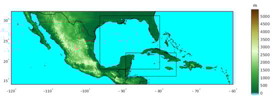In order to select cases for further analysis, thresholds are applied only in areas close to the Yucatan Peninsula (indicated by the two black boxes in Figure 1), taking into account the characteristic scales of tropical disturbances. Since we employ data from 1980 to 2018 (39 years) selecting only days from the rainy season, a total of 7176 days are analyzed, of which only 3145 days passed both filters specified in Equations (1) and (2).