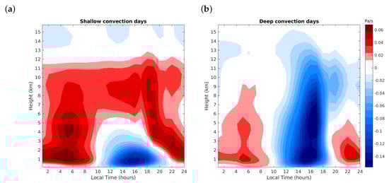 Diurnal cycle of vertical velocity for convection regimes: (a) SC and (b) DC.