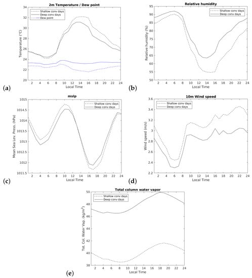 The main surface meteorological variables as a function of the diurnal cycle are shown in Figure 4, which are computed as area-averaged composites for all days in each of the two convection regimes. Note that there are clear differences throughout the diurnal cycle in each regime. The largest differences are found at around 16 and 17 LT, as a result of large differences in convective processes. Nevertheless, our intention is to focus on the behavior of surface meteorological parameters in the morning hours (up to 10 LT), to detect possible factors causing the onset of deep convection. In this regard, there are very small differences in temperature and relative humidity in the early morning, although it is noticeable that surface relative humidity is a bit larger in DC days. Also the dew point temperature is larger in DC than in SC days, while mean sea level pressure (mslp) and 10 m wind speed are smaller in DC than in SC days during the early morning. A large difference is observed in the total column water vapor (tcwv) throughout the diurnal cycle, with DC days about 7 kg/m larger than SC days. This implies that the atmospheric column has about 17.5% more water vapor available in DC days.