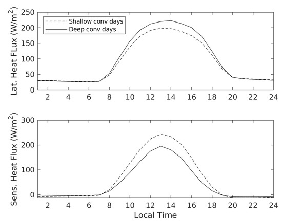 The diurnal cycle of surface latent and sensible heat fluxes for both regimes are displayed in Figure 5. Those fluxes are coupled with the daily cycle of solar radiation, thus exhibiting their maximum around 13–14 LT. Following sunrise, the latent heat flux increases slightly more in DC than in SC days, consistent with the higher humidity and mixing ratio (not shown) present in DC days. As expected, the sensible heat flux is smaller in DC than in SC days, particularly from 10 LT onward, as a result of the temperature decrease associated with reduced solar radiation at the surface due to the larger cloud fraction and precipitation. This behavior of sensible heat flux during diurnal deep convection has been also reported by [13,17] for the southern Great Plains in the US and central Amazonia, respectively.