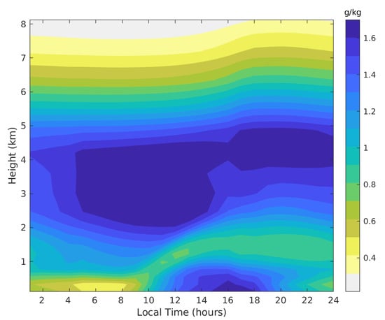To explore the relevance of tropospheric moisture in regime transition, we present in Figure 6 the difference in specific humidity between DC and SC days as a function of time and height. The vertical profile is displayed only up to 8 km, since differences between both regimes were zero above that level. The largest contrast between DC and SC days is located in a layer from 2 to 4 km, especially from 6 to 14 LT. This indicates that, from sunrise to the time when deep convection initiates, there is more humidity available in DC than in SC days. The specific humidity in DC days in the 2–4 km layer is larger than in SC days, by about 1.6 g/kg on average. This is also observed near the surface, but to a lesser extent, with differences below 1 g/kg.