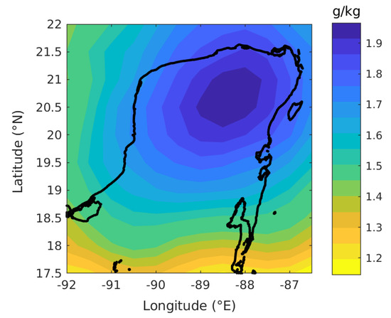 The near surface layer has a southerly component during the early morning, which is the typical pattern during summertime in this region. However, on deep convection days the southerly winds are observed in a deeper layer and are also more intense in magnitude. This fact has implications for convective development since the southerly flow advects moisture and heat from the western Caribbean Sea and from lower latitudes. To further explore this idea, the atmospheric moisture flux through the southern and eastern boundary of the Peninsula was computed (, Equation (4)). Here is the vertically integrated moisture flux between two layers, which is given by Equation (5), where g is the acceleration of gravity, q is the specific humidity, is the vector of horizontal wind, and and are the surface pressure of the inferior and superior layers, respectively. In Equation (4), L is the length of the boundary and n is the outward-pointing normal vector of the boundaries of the region [35,36].