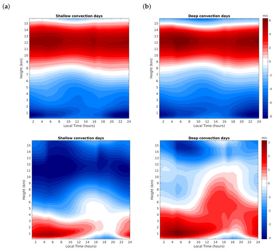 Vertical distribution of the diurnal cycle of the zonal wind component (u) (top panel) and the meridional wind component (v) (bottom panel), for convection regimes: (a) SC and (b) DC.
