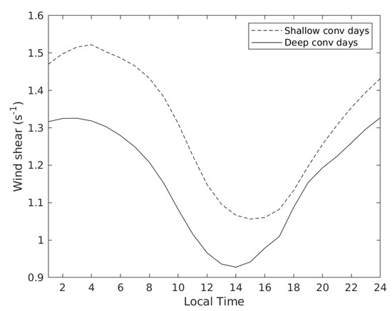 Furthermore, the vertical wind shear was much stronger in shallow convection days than in deep convection days. However, it did not show any significant relationship with the transition and with convection parameters (not shown). This may be due to the fact that for the latter analysis we only selected deep convection days, when wind shear has small values, and less data dispersion.