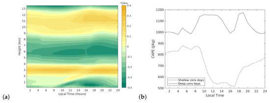 (a) Vertical distribution of the diurnal cycle of the difference (DC–SC) in vertical temperature lapse rate, (b) diurnal cycle of CAPE for convection regimes SC and DC.