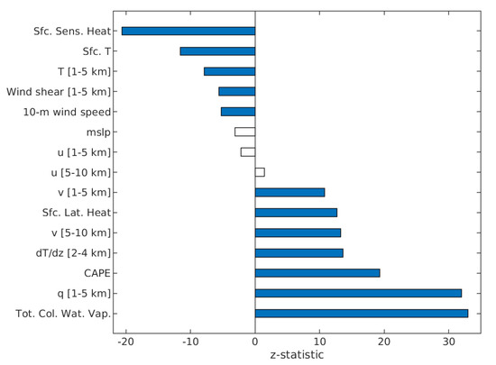 To determine the significance of some of these parameters during the transition, a Mann–Whitney non parametric test for the difference of the medians was applied to the datasets for SC and DC days. Figure 11 shows the results obtained for some of the parameters evaluated. The differences were evaluated at 10 LT, since the aim was to identify the atmospheric conditions during the morning that could lead to regime transition. Note that the total column water vapor is the most important parameter in terms of the difference between regimes, proving to be much larger for DC than for SC. Other variables, such as specific humidity, CAPE, dT/dz, v-wind at low and mid-levels, and surface latent heat flux are also significantly larger on DC than on SC days. On the other hand, both surface sensible heat flux and temperature at 10 LT are lower on DC days. Also vertical wind shear and 10 m wind speed are lower on DC days. Neither the mean sea level pressure nor the zonal wind component had statistically different medians. The analysis of the parameters at 11 LT yielded similar results to these presented for 10 LT.