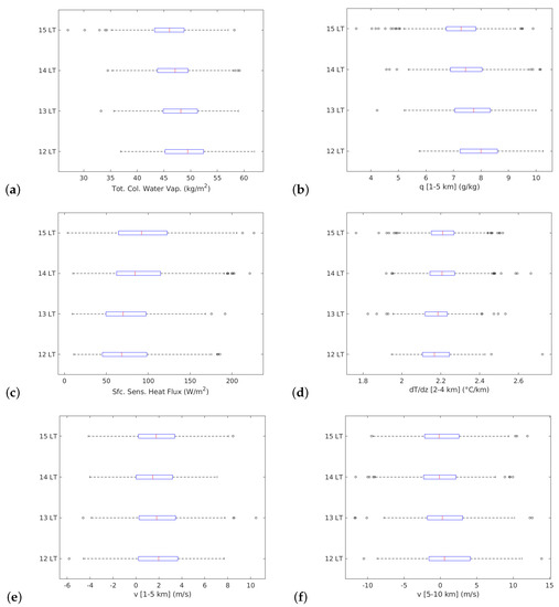 Box-plots of meteorological parameters for different transition times (12, 13, 14 and 15 LT): (a) total column water vapor, (b) specific humidity between 1 and 5 km, (c) surface sensible heat flux, (d) temperature lapse rate, (e) meridional wind component (v) between 1 and 5 km, and (f) between 5 and 10 km.