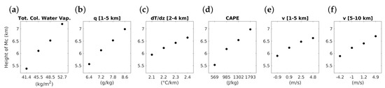 In order to further examine the relationship between atmospheric factors and the transition of shallow to deep convection in our region of interest, the 25th, 50th, 75th and 100th percentiles of the variables that showed the strongest relationship were calculated. Then, the maximum height reached by (Equation (3)) corresponding to those percentiles was plotted, as shown in Figure 13. Note that the temperature lapse rate in the 2–4 km layer evidences a positive relationship with the height of (Figure 13c), denoting that an increase in the atmospheric instability could lead to a vertical deepening of convection, although as shown before, is also associated with a delayed transition. Large values of CAPE are related to an increase in vertical development of cloud mass (Figure 13d), a result that highlights the importance of environmental instability for the intensity of deep convection. Also, larger humidity in the atmosphere corresponds to a vertical increase in height of (Figure 13a,b). The meridional wind at low and mid-levels (between 1 and 5 km) indicate that an increase in the intensity of positive v-component (southern wind) is associated with a deeper vertical ascent (Figure 13e). Similarly, at higher levels (5–10 km), larger negative v-wind correspond to a smaller vertical elevation of the condensate, which suggests that a stronger northerly component of v does not favor deep convection (Figure 13f).