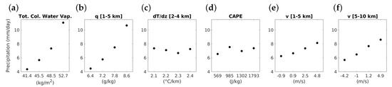 A similar analysis performed for the total precipitation is shown in Figure 14. Note that increasing water vapor in the atmospheric column is associated with larger precipitation amounts (Figure 14a,b). The parameters of atmospheric stability, although showing a positive relationship with the deepening of clouds and with convection development, do not seem to have a relationship with the total precipitation, as evidenced in Figure 14c,d. Regarding the meridional wind component, a subtle behavior is seen, since for different ranges of winds the rainfall only varies by ∼2.5 mm/day. Similarly to the results from the analysis of the transition time and the maximum height of the condensate, large southerly winds (positive values) below 5 km are associated with more rainfall (Figure 14e), while large northerly winds (negative values) above 5 km are linked with less precipitation (Figure 14f).