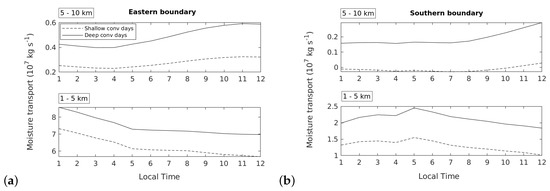 We estimate for two layers: below and above 5 km, following from the previous analysis, to explore the importance of the humidity advection in each layer. Figure 15 shows that moisture transport is always larger in the eastern boundary for both layers, although with an order of magnitude of difference between the two layers. As expected, the humidity that enters the Peninsula is always larger on DC days. However, a more surprising result is that on SC days the humidity entering through the southern boundary in the 5–10 km layer is near zero during the morning and up to 10 LT (Figure 15b, top panel). This indicates that an important source for convective development—moisture advection from the Caribbean Sea—is missing; in contrast, in DC days there is a strong moisture flux through the southern boundary in this layer, with values up to 2 × 10 kg s. This moisture flux is an important element to trigger deep convection, since low- to mid-levels during the early morning are more humid providing shallow convection with a more favorable environment for the transition.