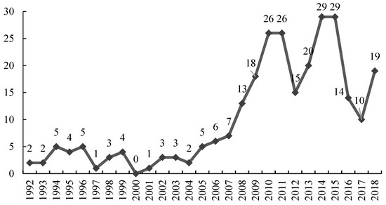 In the 1930s, Norval realized the importance of climate on tourists’ choice of destination [18]. Furthermore, systematic research on the tourism climate emerged in the 1960s in Western countries and developed rapidly in the 1990s, while in China, research on tourism climate began in the 1990s. Figure 2 shows the annual number of core Chinese papers on tourism climate from 1992 to 2018 in China, which is a side reflection of the history of tourism climate research. In light of the annual number of tourism climate papers (Figure 2, Table 1), considering the regional climate situation in China, the research process can be divided into four stages: 1992–2007, 2008–2011, 2012–2015, and after 2015.