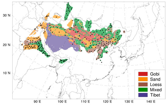 Spatial distribution of World Meteorological Organization synoptic stations (black circles) and surface soil types over the dust source regions for Asian Dust Aerosol Model 2 (ADAM2) (i.e., Gobi, Sand, Loess, Mixed, and Tibet).