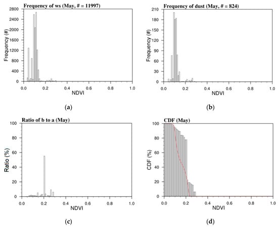 Occurrence frequencies of (a) wind speed exceeding the threshold wind speed and (b) dust-rise with respect to normalized difference vegetation index (NDVI) in the interval of 0.01. (c) Percentage ratio of b to a. (d) Cumulative dust-rise occurrence probability function (CDF) for the Gobi soil type region in May. The red line indicates the cumulative dust-rise occurrence probability function in [12].