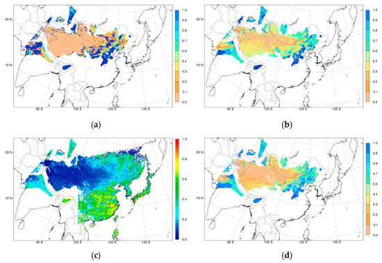 Figure 2 shows an example of calculating the cumulative dust-rise occurrence probability function in the Gobi soil type region in May. First, we examined the frequency distribution of wind speeds that exceeded the threshold wind speed (Figure 2a) and the dust-rise occurrence frequency (Figure 2b) in an NDVI range of 0 to 1 with an interval of 0.01. The dust-rise occurrence probability function (Figure 2c) was then obtained by normalizing the frequency of dust-rise occurrence (Figure 2b) by dividing it by the frequency of wind speed exceeding the threshold wind speed (Figure 2a). The dust-rise occurrence frequency (DOF(%)) is calculated as follows: