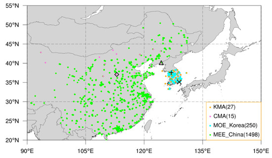 To validate the simulation in this study, we used the ground-based PM10 observation data from 27 KMA sites, 15 China Meteorological Administration (CMA) sites, 250 Ministry of Environment (MOE) sites in Korea, and 1498 Ministry of Ecology and Environment (MEE) sites in China.