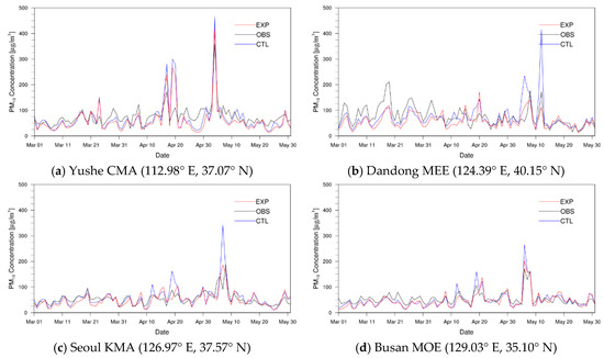 Time series of PM10s observations (black line) and dust emissions simulated by ADAM2 (current version (CTL) (blue) and new version (EXP) (red)) at (a) Yushe, (b) Dandong, (c) Seoul, and (d) Busan sites during March to May, 2017.