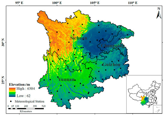 Southwest China is located between 21–34° N and 97–110° E and mainly consists of three provinces, Yunnan, Sichuan, and Guizhou, and a municipality, Chongqing. It is also one of the most densely populated regions in China, accounting for about one-sixth of the total national population. The area is dominated by a subtropical monsoon climate with the characteristics of a dry winter and wet summer (the mean precipitation from April to October constitutes more than 85% of the total) [41]. The average annual temperature is 14–24 °C in most areas, and the average annual precipitation is more than 900 mm.