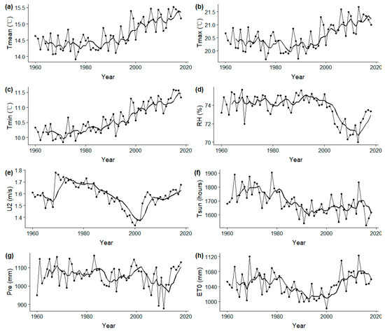 Annual average and 5-year moving average (a) air temperature (Tmean), (b) maximum temperature (Tmax), (c) minimum temperature (Tmin), (d) relative humidity (RH), (e) wind speed (U2), (f) sunshine hours (Tsun), (g) precipitation (Pre), and (h) reference evapotranspiration (ET0) of the Southwest China region from 1960 to 2018.