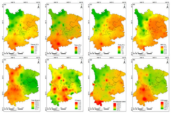 Spatial distribution of annual ET0 (h) and climatic factors, including (a) mean air temperature (Tmean), (b) maximum temperature (Tmax), (c) minimum temperature (Tmin), (d) relative humidity (RH), (e) sunshine hours (Tsun), (f) wind speed (U2), (g) precipitation, and (h) reference evapotranspiration (ET0).