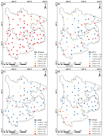 Spatial pattern trends in climatic driving factors of ET0 from 1960 to 2018: (a) Mean air temperature (Tmean), (b) wind speed (U2), (c) relative humidity (RH), and (d) sunshine hours (Tsun). Triangles of different sizes indicate trends of different magnitudes. MK, Mann–Kendall test.
