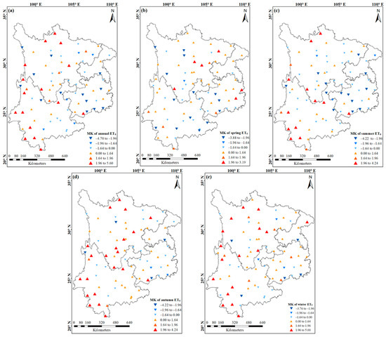 Spatial distribution of annual and seasonal trends in ET0 from 1960 to 2018: (a) Annual ET0, (b) spring ET0, (c) summer ET0, (d) autumn ET0, and (e) winter ET0. Triangles of different sizes indicate trends of different magnitudes. MK, Mann–Kendall test.