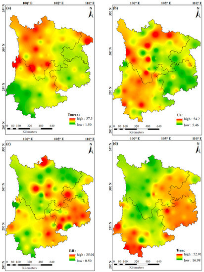 Spatial distribution of the relative contributions of key climatic driving factors for ET0 from 1960 to 2018 in Southwest China: (a) Mean air temperature (Tmean), (b) wind speed (U2), (c) relative humidity (RH), and (d) sunshine hours (Tsun).