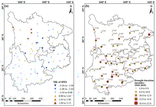 Spatial distribution of annual trends in SPEI (12-month timescales), drought duration, and frequency (identified by SPEI at 3-month timescale) from 1960 to 2018 in Southwest China: (a) Trends in SPEI; (b) drought duration and frequency (the numbers show drought frequency). MK, Mann–Kendall test.