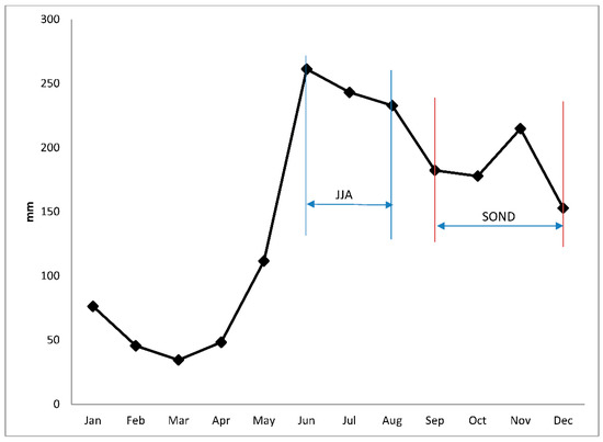 Monthly precipitation climatology (mm, 1946–2006) for Piarco, Trinidad, showing the early (June–July–August, JJA) and late (September–October–November–December, SOND) rainfall seasons. Precipitation data were obtained from the Trinidad and Tobago Meteorological Service (TTMS).