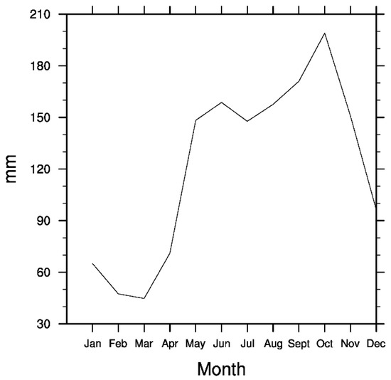 Precipitation in Trinidad shows similarities but also has distinct features when compared to the average rainfall of the entire Caribbean region. They both have reduced rainfall during January–February–March (JFM) and a mid-summer dry (MSD) period during their rainy seasons. The MSD period is identified as the time between the first and second rainy season precipitation maxima [32]. Rainfall climatology for the southernmost island of the Caribbean differs (Figure 2) from that of the Caribbean (Figure 3) in the timing of the primary and secondary maxima. The intra-annual variation of rainfall in Trinidad has two maxima with the first peak occurring in June or July and the second in November [33]. The precipitation climatology for Trinidad for the period of 1946–2006 (Figure 2) shows the early (June–July–August) (JJA) and late (September–October–November–December) (SOND) rainy seasons. In contrast, the intra-annual variation of the Caribbean rainfall is characterized by two rainfall maxima with the primary peak occurring in October and the secondary rainfall maximum in June (Figure 3). The Caribbean’s average monthly precipitation totals in Figure 3 were obtained from the Global Precipitation Climatology Centre (GPCC) for the period of 1981–2016 [34]. The gridded gauge-based data comprise of quality-controlled data sets of ten (10) years or longer from sixty-seven thousand and two hundred (67,200) stations located worldwide. The analysis product contains monthly totals on a regular grid of a 2.5° × 2.5° latitude by longitude spatial resolution. The time series was calculated from monthly totals averaged over the area of 10°–20° N, 65°–83° W. In addition, we note that the monthly climatology for Caribbean precipitation obtained from an area average of station data from twenty-two (22) islands by Chen and Taylor [13] characterize a relatively dry winter [10,12,31] from December to March and an early (April–July) and a late (August–November) rainy season. The observed monthly climatologies for Trinidad and the Caribbean are supported by station pentad rainfall climatologies by Martinez et al. [35], who found that “the bimodal rainfall pattern in Trinidad and Guianas is distinct from the climatological bimodal pattern seen in most of the Caribbean.”